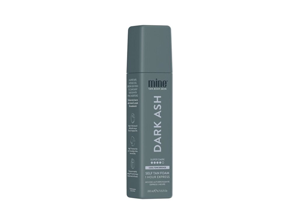 Samoopalovací pěna Dark Ash vytváří chladný, intenzivně tmavě hnědý efekt už po 1 hodině působení. Popelavé bronzery neutralizují červené a zlaté podtóny pro přirozený „beach bronze“ vzhled bez falešně oranžové. Vhodná na tělo i obličej a pro všechny typy pleti, zejména pro světlou a načervenalou. Bez typického zápachu samoopalováků.