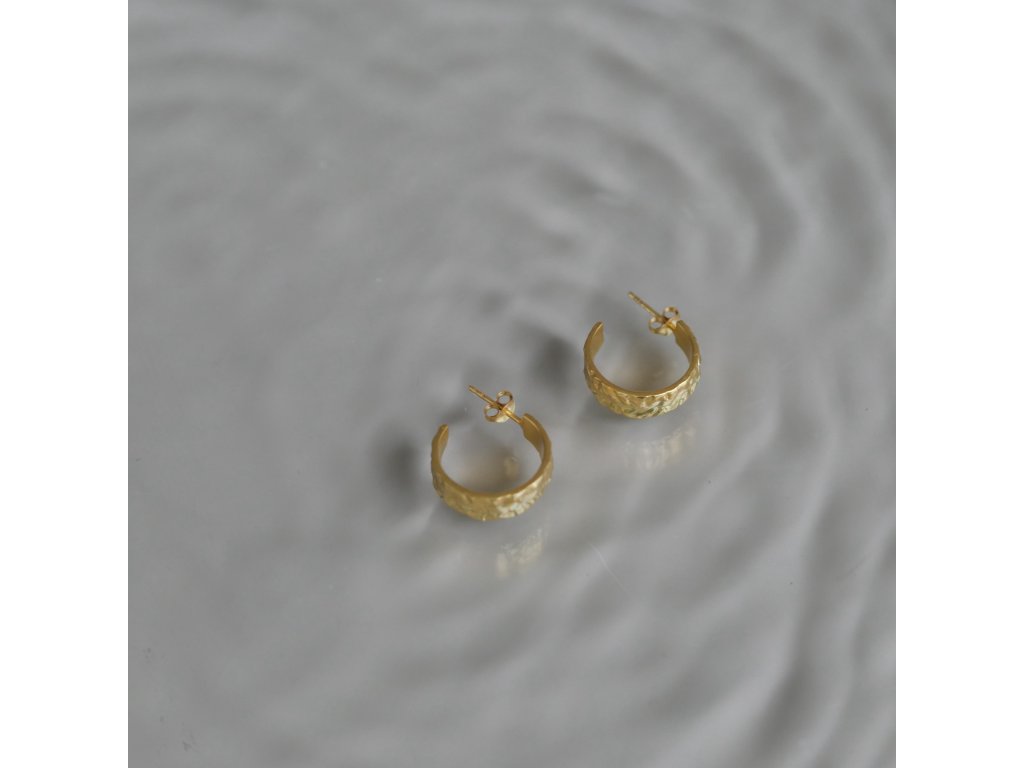 Náušnice jsou ručně vyrobené ze stříbra Ag925 a dostupné také ve verzi pozlacené 22k zlatem. Jemný kruhový tvar s decentní strukturou z nich dělá nadčasový doplněk pro každý den.